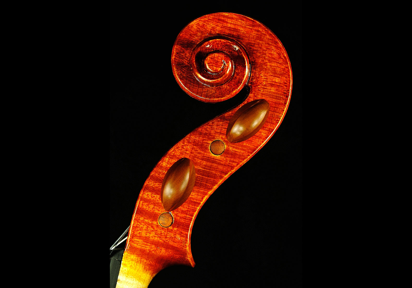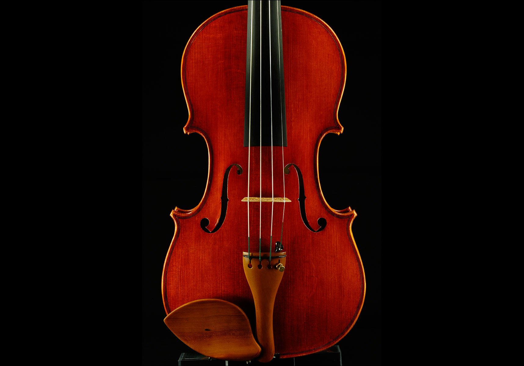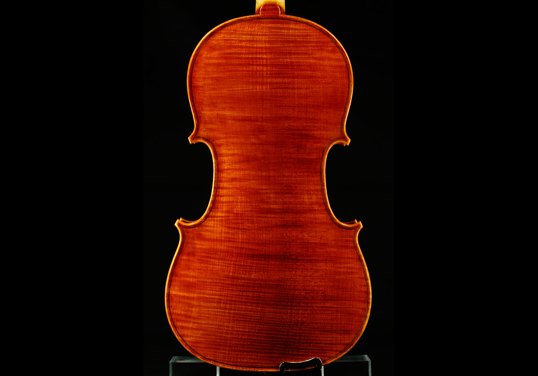 Modello Stradivari 1715. Lunghezza della cassa 35,8cm. Lo strumento è stato costruito con un modello personale della forma “G” di Antonio Stradivari. Il fondo è di un pezzo unico di acero dei Balcani con marezzatura medio fine profonda. La testa e le fasce sono dello stesso materiale del fondo. La tavola è in abete rosso di risonanza della Val di Fiemme con venatura fine regolare. La verniciatura è ad alcool di colore giallo-arancio ambra con riflessi rosso-dorati.